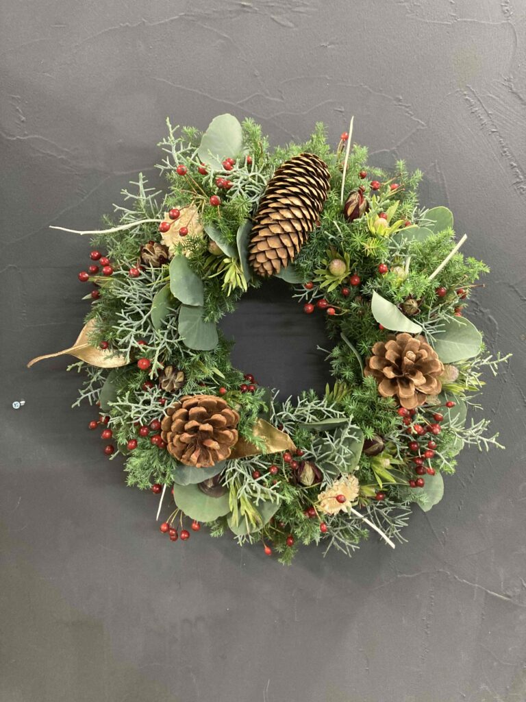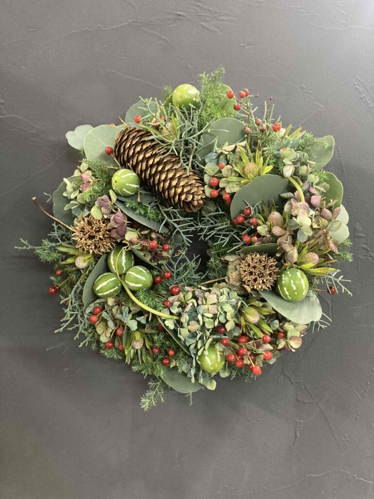 ドライフラワーや造花のリースとは違い、摘みたての植物そのものの香りや瑞々しさを楽しめるのが特徴。特に冬の時期は、常緑樹やベリーなどの花材が豊富で、季節感あふれるナチュラルなリースを作ることができます。